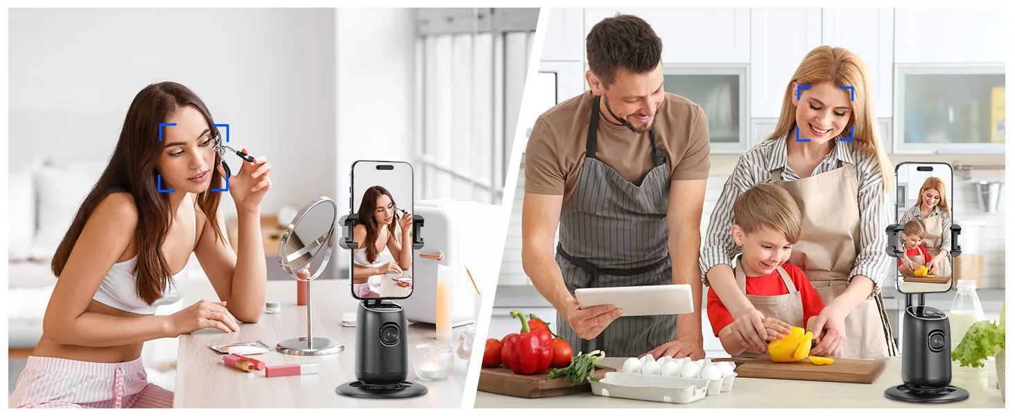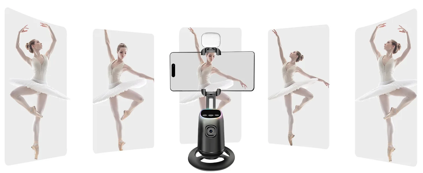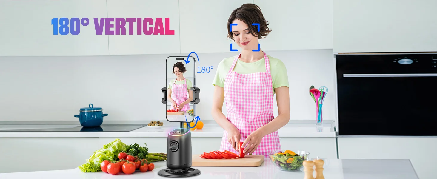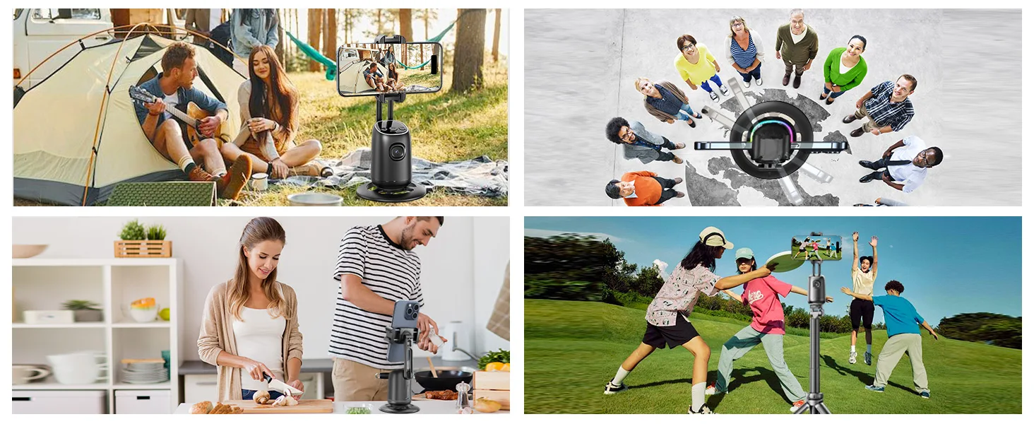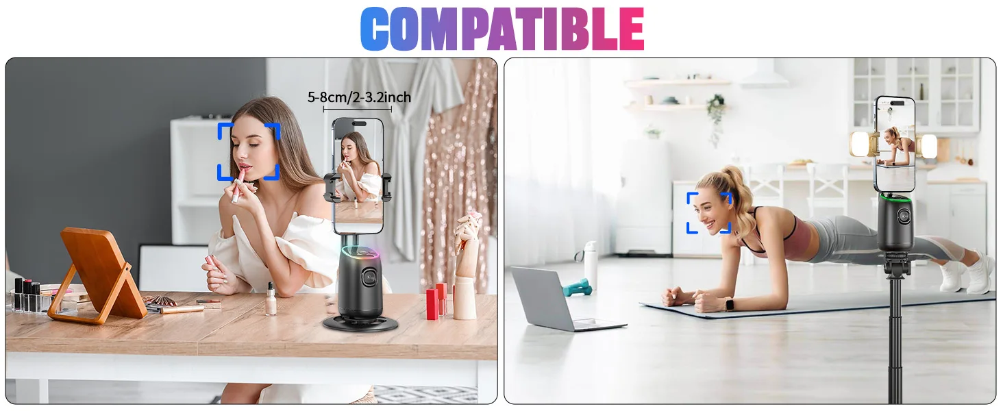 Supports 270° vertical and 360° horizontal rotation, with a 1/4 interface compatible with smartphones and cameras. Ideal for selfies, panoramic photography, or professional shoots. Warm tips: Avoid rapid movements for optimal face tracking, and manually adjust the camera for vertical views.