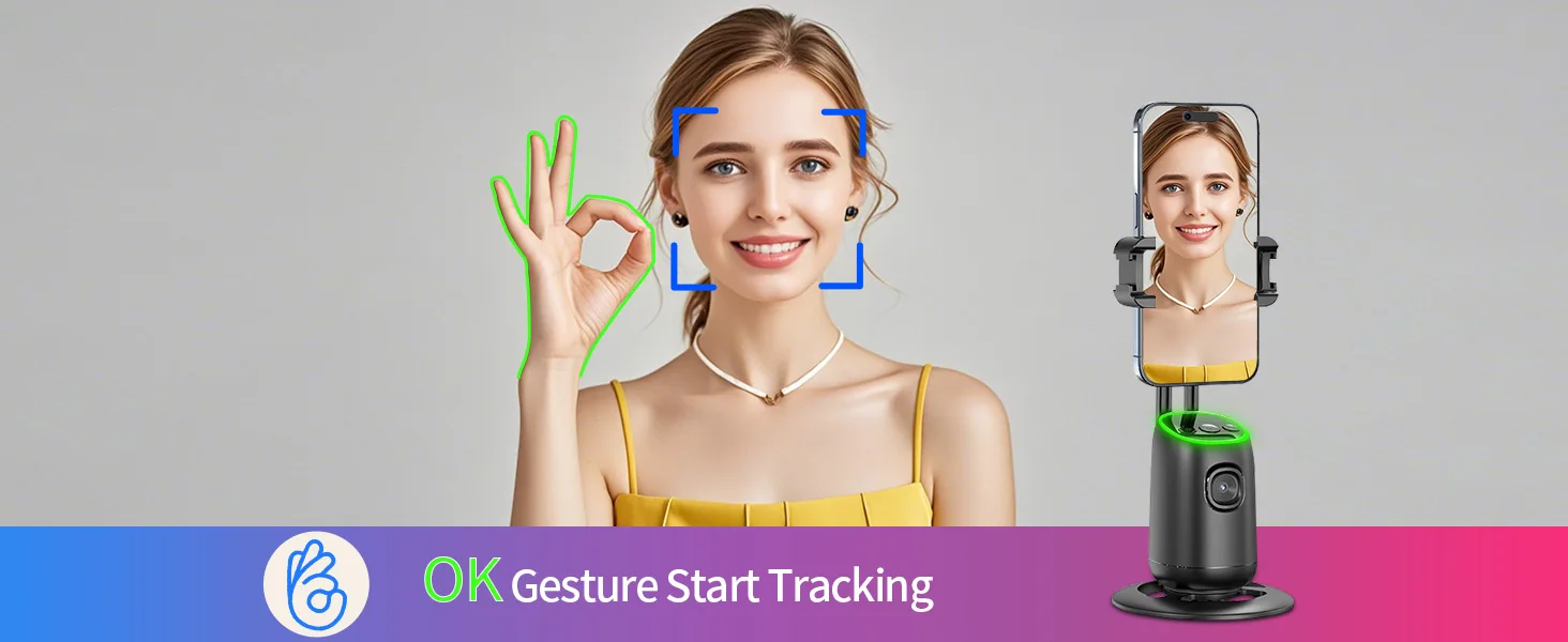 Built-in AI automatically tracks faces or bodies during videos and live streams. Gesture recognition enables starting recording with an "OK" gesture and pausing with an open palm gesture. Effective range up to 5 meters