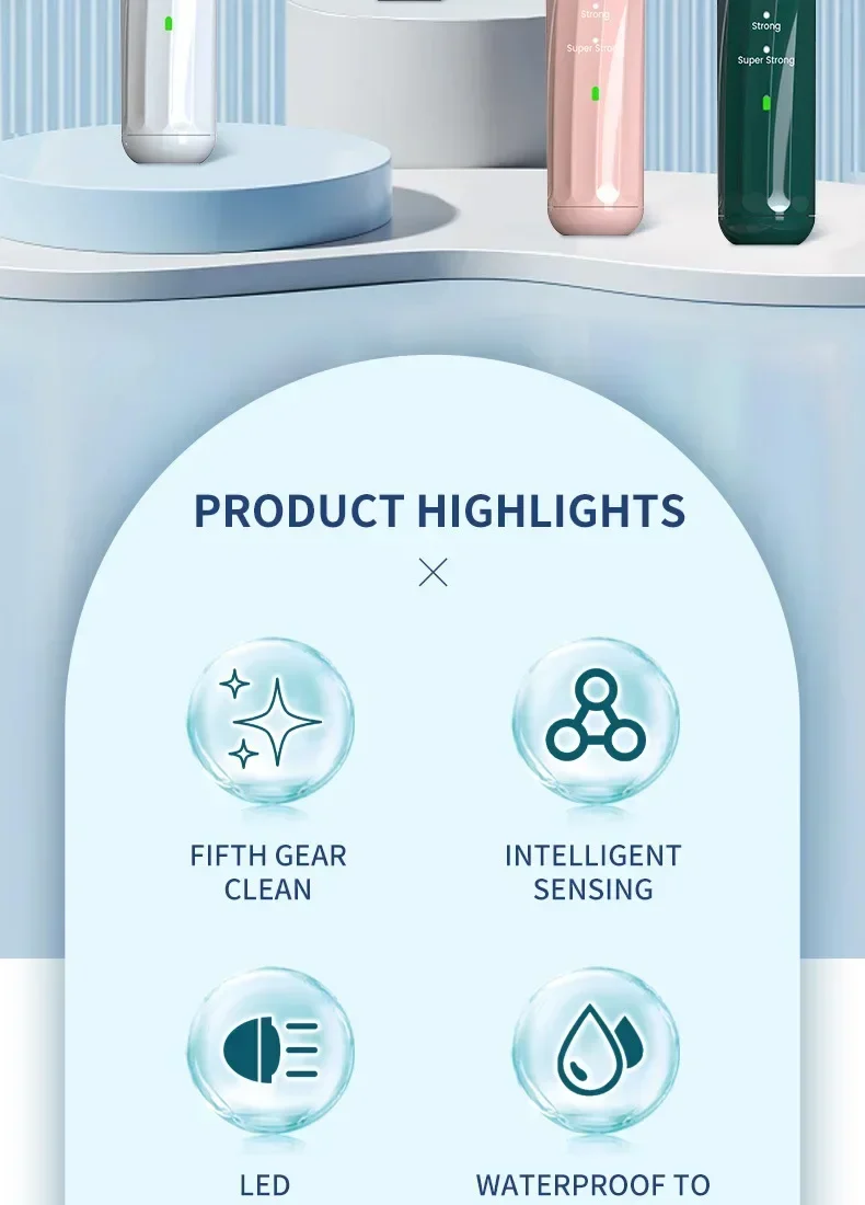 The ion generator produces ions, which are transferred to the teethby the hand-held ion connecting ring.The teeth dirt is separated from the teeth loosely by the principle ofnegative ion repelling